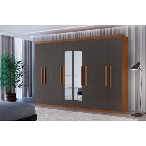 Guarda Roupa Casal Hera Premium Com Espelho 8 Portas Moderna Naturalle Grafite Guarda Roupa Casal Hera Premium com Espelho 8 Portas e 4 Gavetas MDF Moderna O Guarda-Roupa Hera Premium e sinonimo de praticidade e elegancia. Produzido em 100 MDF, ele oferece um design minimalista com um toque de requinte que se destaca em qualquer ambiente. Com 8 portas, 4 gavetas e 4 cabideiros, sua ampla e bem planejada divisao interna proporciona o espaco ideal para guardar seus pertences com organizacao e eficiencia. E seu destaque a parte, com um espelho central que facilita o processo de se arrumar, alem de facilitar a sua rotina, o Hera Premium traz harmonia e sofisticacao ao seu lar, tornando-o um aliado perfeito para quem valoriza um estilo de vida organizado e estiloso.