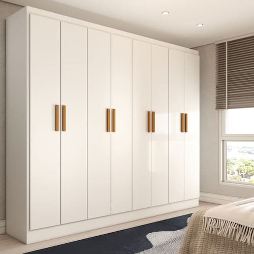 O(a) Guarda-Roupa Casal Hilton 8 Portas Branco - Loja é produzido em MDP na escala de brilho Semi-Brilho, e possui um grau de dificuldade de montagem: Médio.