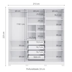 Produzido em MDP, material de alta qualidade, com chapa de 15mm, ele conta com três portas de correr e o tamanho ideal para todos os ambientes, com 2,23m de altura, 2,13m de largura e 53cm de profundidade. E são sete camadas de pintura, tanto na parte interna quanto na externa, o que garante mais durabilidade e beleza ao seu móvel.