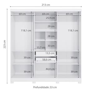 Produzido em MDP, material de alta qualidade, com chapa de 15mm, ele conta com três portas de correr e o tamanho ideal para todos os ambientes, com 2,23m de altura, 2,13m de largura e 53cm de profundidade. E são sete camadas de pintura, tanto na parte interna quanto na externa, o que garante mais durabilidade e beleza ao seu móvel.