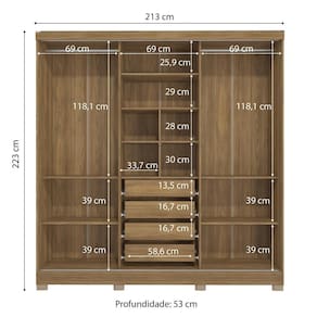 Produzido em MDP, material de alta qualidade, com chapa de 15mm, ele conta com três portas de correr e o tamanho ideal para todos os ambientes, com 2,23m de altura, 2,13m de largura e 53cm de profundidade. E são sete camadas de pintura, tanto na parte interna quanto na externa, o que garante mais durabilidade e beleza ao seu móvel.