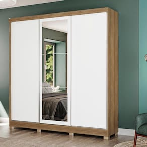 E para completar o charme do guarda-roupa, ele conta com corpo na cor nogueira, com pintura touch, que traz a textura dos veios da madeira, enquanto suas portas são reversíveis, possibilitando escolher entre as cores macadâmia e branco, com acabamento em brilho, garantindo muita beleza para seu espaço. E com espelho de corpo inteiro e pés em polipropileno, esse modelo será o destaque do seu espaço, proporcionando beleza e praticidade ao seu dia a dia.