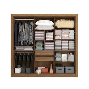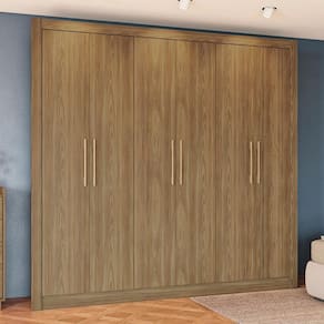 Cabideiro: Metálicos | Cor: Nogueira | Corrediças: Metálicas | Garantia: 3 meses para defeito de fabricação | Gavetas: Internas | Maleiro: Sim | Matéria-prima: MDP | Peso suportado por cabideiro: 10 | Peso suportado por cada prateleira: 7 kg | Peso suportado por gaveta: 6 kg | Quantidade de gavetas: 2 | Quantidade de portas: 6 | Quantidade de prateleiras: 9 | Sistema de montagem: Parafuso Philips e Minifix | Tipo de porta: Bater