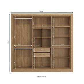 Já na parte interna, ele dispõe de ótimas divisões e muito espaço, com nichos de tamanhos diferentes, ideal para guardar calçados e roupas dobradas nas prateleiras. E para peças maiores, como vestidos ou casacos, ele conta com dois cabideiros metálicos, garantindo mais praticidade. Muito versátil, esse modelo ainda possui duas gavetas internas, facilitando a organização de peças menores.
