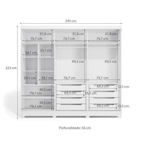 Na cor Branca, com 3 portas de correr e 8 gavetas, espelho em uma porta e pés em polipropileno, ele tem o tamanho ideal para um quarto de casal. Todo produzido com chapas de 15mm, o que garante mais robustez, firmeza e qualidade ao seu guarda-roupas.