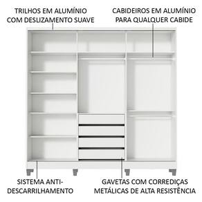 - Itens inclusos: Três cabideiros | Quatro gavetas internas | Oito prateleiras | Três portas de correr com sistema anti-descarrilhamento