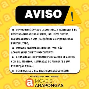 Observações Importantes - As imagens ambientadas são meramente ilustrativas e podem apresentar itens que não incorporam o produto; - Todos os nossos produtos são novos, acompanham documento fiscal e possuem garantia de 3 meses, essa garantia cobre somente defeitos de fabricação; - A entrega só será efetuada no endereço do CEP, caso o endereço seja diferente do CEP informado no pedido, a entrega terá cobrança adicional e o comprador arcará com as despesas; - Não realizamos entregas para zonas rurais, via caminhos fluviais e distritos, por isso não aceitamos CEP GERAL da região; - Não é possível realizar o agendamento de entrega do produto, é necessário que acompanhe o rastreio de seu pedido para saber a previsão de entrega; - As entregas somente serão realizadas para um responsável maior de idade (+18); - Enviamos para diversos estados, sendo assim nossas entregas são realizadas por transportadoras parceiras de nossa empresa. Confira as dimensões antes da compra e certifique-se de que o produto passará por elevadores, portas e corredores já que nossa entrega não inclui a subida de lances de escada, transporte por elevador e o lançamento de produtos, em caso de condomínios residenciais a entrega é feita somente até a portaria. Todas as entregas são realizadas em dias e horários comerciais; - Ao receber os seus produtos observe se a embalagem se encontra em perfeitas condições. Se você adquiriu algum móvel, confira atentamente a quantidade de volumes e o aspecto físico das embalagens. Confira também se a cor do móvel está de acordo com o seu pedido; - O prazo de cancelamento por arrependimento é de até 7 dias corridos a contar da data de recebimento; - Os produtos e assistências são enviados DESMONTADOS, MONTAGENS E DESMONTAGENS recomendamos sempre a contratação de um montador profissional e é válido lembrar que o custo desses serviços é por conta do comprador; - Objetos decorativos que aparecem na foto não acompanham o produto; - Evitar a exposição direta à luz solar e à umidade; - Para limpeza, limpar com pano macio e seco, não utilizar qualquer outro tipo de produtos químicos; - As cores do produto podem variar de acordo com o monitor, a iluminação do ambiente ou sua percepção visual.