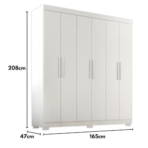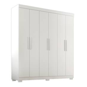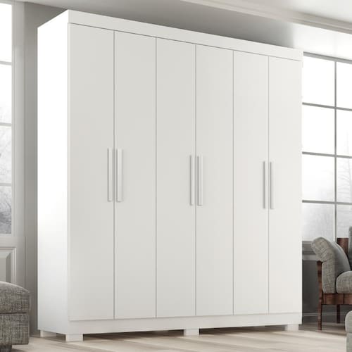 6 portas de dobradiças 9 prateleiras 2 gavetas com Corrediças Metálicas Puxadores em MDF Fabricado em MDP Acabamento Touch Alto-Relevo ou Alto Brilho UV (nas cores Branco e Off-white) e Semibrilho parte interna Pés inclusos 2 cabideiros de madeira Fácil montagem