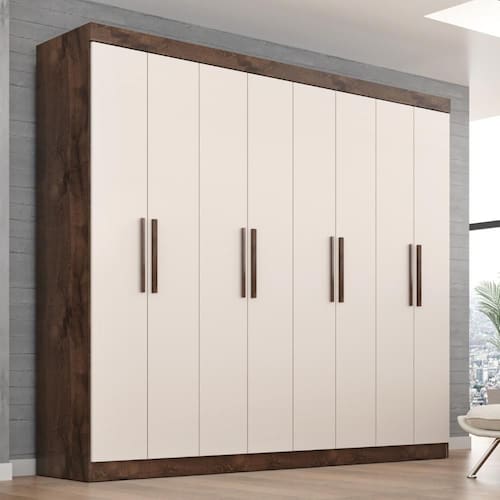 8 portas de dobradiças 10 prateleiras 4 gavetas com Corrediças Metálicas Puxadores em MDF Fabricado em MDP Acabamento Touch Alto-Relevo ou Alto Brilho UV (nas cores Branco e Off-white) e Semibrilho parte interna 2 cabideiros de madeira Fácil montagem