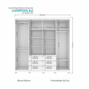 O Guarda-Roupa Liverpool é um móvel prático e funcional, e se encaixa em qualquer ambiente do quarto de casal ou solteiro. Com 8 portas e 6 gavetas, esse roupeiro garante muito espaço para guardar todas as roupas. Puxadores em ABS garantem um design moderno. Internamente, possui amplas prateleiras para guardar todas as roupas de forma organizada, assim como edredons, cobertores, caixas, travesseiros, decoração, etc. Possui 3 cabideiros em alumínio para pendurar todas as roupas (casacos, vestidos, camisas, blusas) com muita organização e segurança. Um guarda-roupa de casal completo e muito prático para o seu quarto.