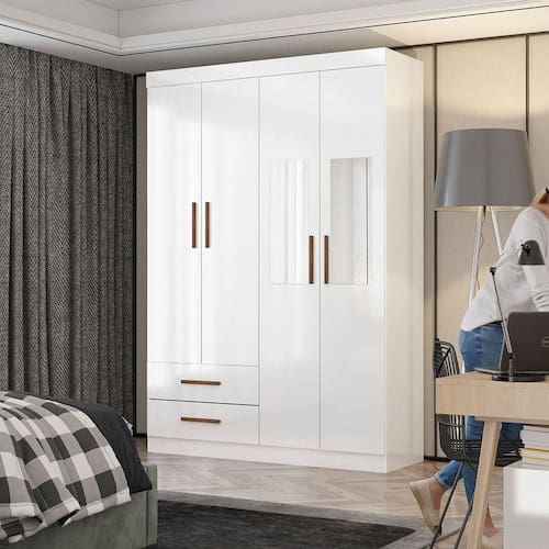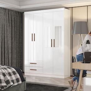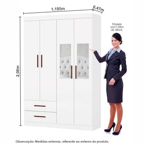 Guarda Roupa Casal Lu 4 Portas 2 Gav. Espelho Carioca Móveis Branco A linha Lu e ideal para quem procura um produto compacto e funcional. Possui 2,00m de altura, 1,185m de largura e 0,47m de profundidade combinado com 2 gavetas, 2 prateleiras e um grande cabideiro, deixando o produto com uma otima divisao interna. O maleiro e ideal para guardar malas, cobertores, edredons. O cabideiro alem de resistente, e ideal para pendurar pares de blusas, camisas acessorios. As prateleiras sao perfeitas para colocar roupas como blusas, shorts, regatas, kits de maquiagem, toalhas, caixinhas com acessorios e bolsas menores. As gavetas fixadas sobre corredicas metalicas, sao ideais para guardas blusas dobradas, shorts, malhas e roupas intimas. Estrutura do produto em MDP. Caracteristicas: Marca: Carioca Moveis Modelo: Lu Material da Estrutura: MDP Quantidade de Portas: 04 Quantidade de Gavetas: 02 Quantidade de Prateleiras: 02 Com Espelho: Sim