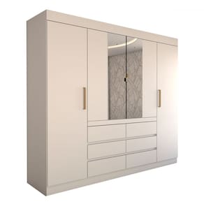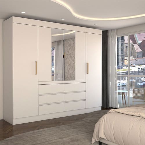 O(a) Guarda-Roupa Casal Luxuria 4 Portas 6 Gavetas com Espelho Branco - Loja é produzido em MDP na escala de brilho Semi-Brilho, e possui um grau de dificuldade de montagem: Médio.