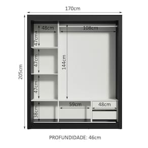 Medidas totais do armário: 205 cm de altura x 170 cm de largura x 46 cm de profundidade.