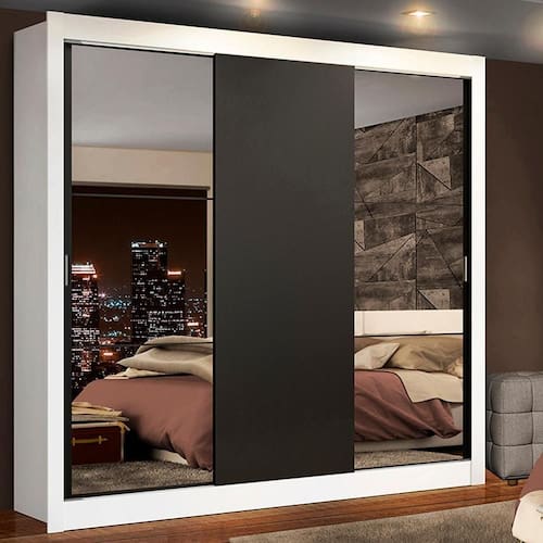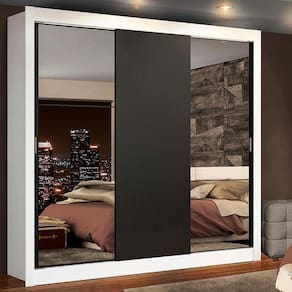 Guarda-Roupa de Casal com ferragens de qualidade, cabideiro metálico e pintura em Poliéster Protetor que confere durabilidade e resistência. As portas de correr possuem trilho superior e inferior em alumínio e sistema de deslizamento suave, garantindo melhor funcionamento. Além disso, os espelhos presentes em duas das portas ampliam o ambiente e são bastante práticos.