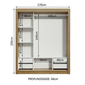 Medidas totais do armário: 205 cm de altura x 170 cm de largura x 46 cm de profundidade.