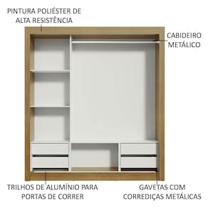 Possui total aproveitamento interno levando em conta o uso de duas pessoas. São quatro gavetas internas com corrediça metálica, diversos nichos que facilitam a organização de roupas, calçados e acessórios. O tubo cabideiro é muito resistente e possui espaço para roupas longas.