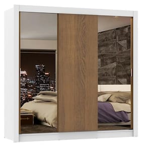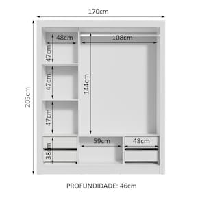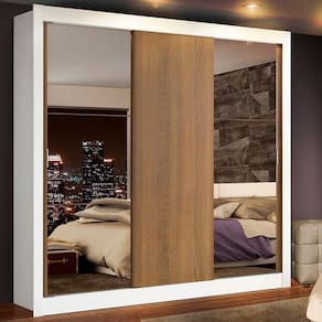- Itens inclusos: Três (3) prateleiras totalizando quatro (4) nichos | Quatro (4) gavetas internas brancas | Um (1) cabideiro grande | Três (3) portas de correr sendo uma (1) de madeira e duas (2) com espelhos e puxadores em PVC