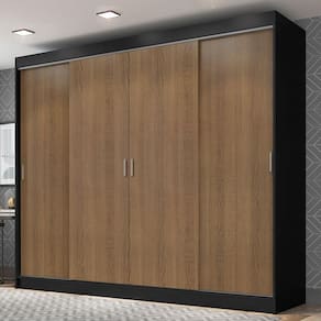 O móvel conta com quatro portas de correr com deslizamento suave, trilhos em alumínio para maior resistência e quatro puxadores externos. Além disso, o sistema anti-descarrilhamento evita com que as portas saiam do trilho e transmitem mais segurança no uso diário.