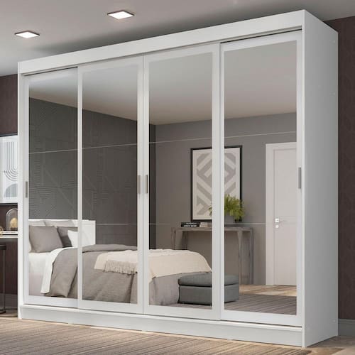 Itens inclusos: - Quatro (4) portas de correr com sistema anti-descarrilhamento, todas com espelhos - Quatro (4) puxadores em PVC - Três (3) gavetas internas com corrediças metálicas - Dois (2) cabideiros em alumínio