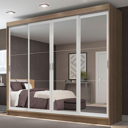 Itens inclusos: - Quatro (4) portas de correr com sistema anti-descarrilhamento, todas com espelhos - Quatro (4) puxadores em PVC - Três (3) gavetas internas com corrediças metálicas - Dois (2) cabideiros em alumínio