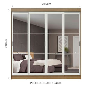 Medidas totais do guarda-roupa: 218 cm de altura x 215 cm de largura x 54 cm de profundidade.