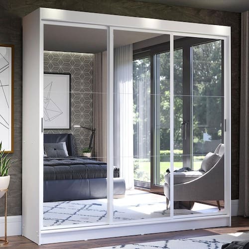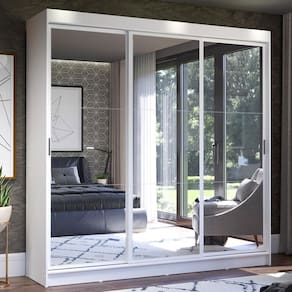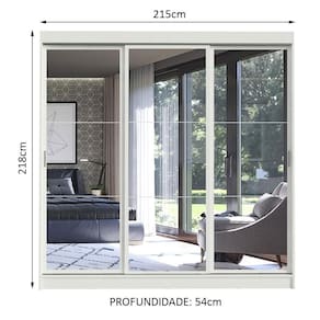 Itens inclusos: - Três (3) portas de correr com sistema anti-descarrilhamento, todas com espelhos - Dois (2) puxadores em alumínio com detalhes em PVC - Três (3) gavetas internas com corrediças metálicas - Dois (2) cabideiros em alumínio