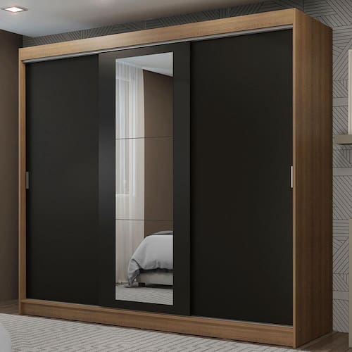 O Guarda-Roupa Kansas da Madesa possui três portas de correr com deslizamento suave, trilhos em alumínio para maior resistência e dois puxadores externos. Uma das portas possui o diferencial dos espelhos, que são muito úteis no uso diário.
