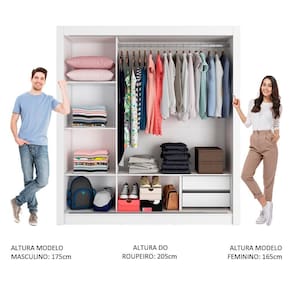 O aproveitamento interno é ideal para um casal. São duas gavetas com corrediça metálica, além de vários nichos que facilitam a organização de roupas, calçados e acessórios. O tubo cabideiro é metálico, muito resistente e possui espaço para roupas longas.