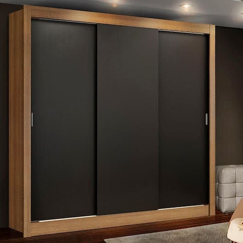 Itens inclusos: - Três (3) prateleiras totalizando quatro (4) nichos - Quatro (4) gavetas internas brancas - Um (1) cabideiro grande - Três (3) portas de correr e dois (2) puxadores em PVC