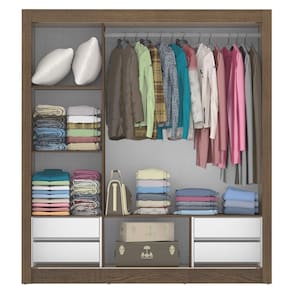 Total aproveitamento interno levando em conta o uso de duas pessoas. Nesta versão com quatro gavetas internasbrancas com corrediça metálica, diversos nichos que facilitam a organização de roupas, calçados e acessórios. O tubo cabideiro é muito resistente e possui espaço para roupas longas.