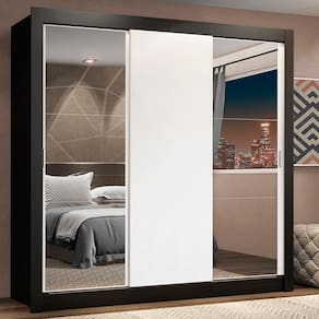 Guarda-Roupa de Casal com ferragens de qualidade, cabideiro metálico e pintura em Poliéster Protetor que confere durabilidade e resistência. As portas de correr possuem trilho superior e inferior em alumínio e sistema de deslizamento suave, garantindo melhor funcionamento. Além disso, os espelhos presentes em duas das portas ampliam o ambiente e são bastante práticos.