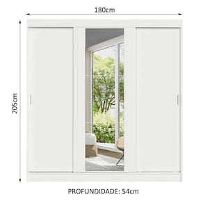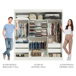 Medidas totais do guarda-roupa: 205 cm de altura x 180 cm de largura x 54 cm de profundidade.