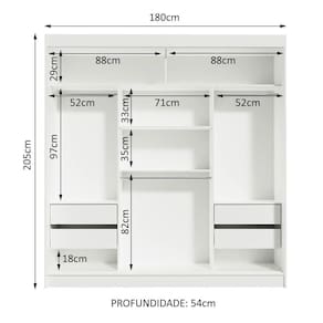 Medidas totais do guarda-roupa: 205 cm de altura x 180 cm de largura x 54 cm de profundidade.