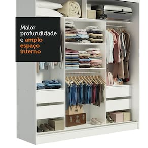 Possui também quatro gavetas espaçosas, dois cabideiros com espaço para roupas longas e um cabideiro para roupas mais curtas. Tem lugar pra tudo que um casal precisa: malas, calçados, travesseiros, colchas e muito mais!