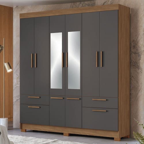 O(a) Guarda-Roupa Casal Marilena 6 Portas 9 Gavetas Jatoba/Grafite com Espelho - Pnr Móveis é produzido em MDF, MDP e HDF na escala de brilho Fosco, e possui um grau de dificuldade de montagem: Médio.
