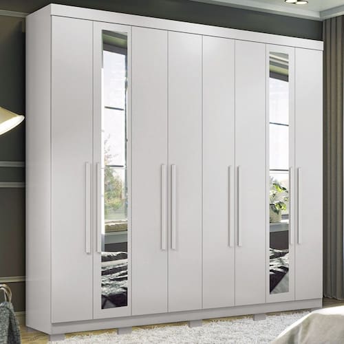 O(a) Guarda-Roupa Casal Master New 8 Portas 4 Gavetas com Espelho Branco - Santos Andirá é produzido em MDF, MDP e HDF na escala de brilho Semi-Brilho, e possui um grau de dificuldade de montagem: Médio.