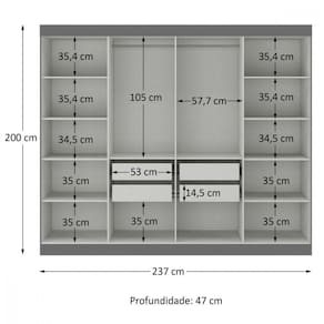 Seu layout interno permite melhor organizacao de roupas longas, dobradas e acessorios. As gavetas com corredicas telescopicas proporcionam abertura suave e maior vida util, enquanto os varoes e calceiro em madeira garantem firmeza e sofisticacao.