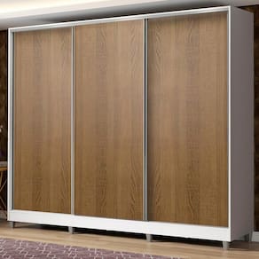 - Itens inclusos: Três cabideiros | Quatro gavetas internas | Oito prateleiras | Três portas de correr com sistema anti-descarrilhamento