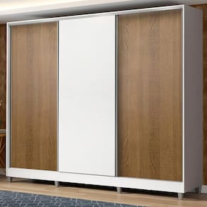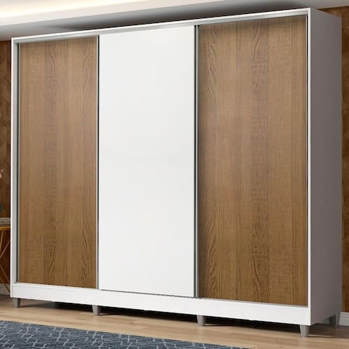 - Itens inclusos: Três cabideiros | Quatro gavetas internas | Oito prateleiras | Três portas de correr com sistema anti-descarrilhamento