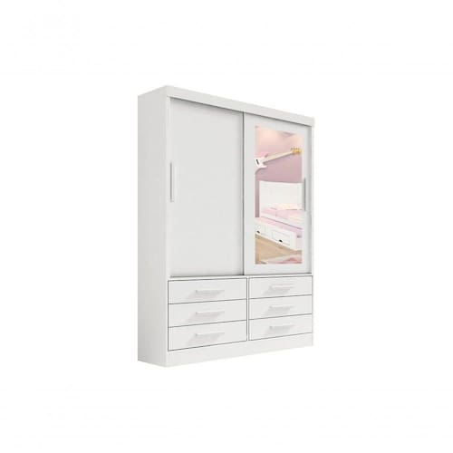 ? 2 portas de correr e 6 gavetas; ? Portas, Moldura e Frente Gavetas em MDF; ? Corrediça telescópica 40cm; ? Profundidade da gaveta 40cm; ? Abertura total da gaveta; ? Suporte cabide metálico; ? Cabideiro em alumínio; ? Produzido com chapa de 15mm; ? Pé opcional; ? Trilho antiquedas de portas.