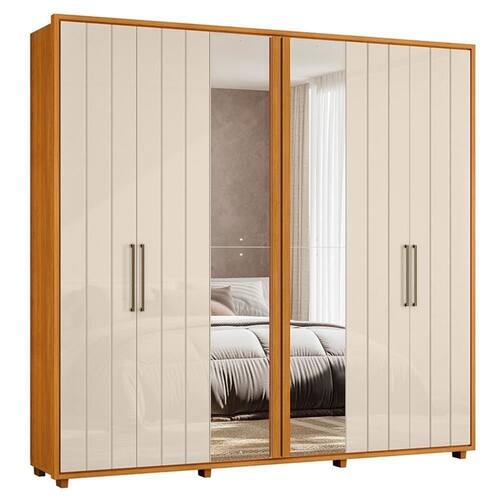 Guarda Roupa Casal Miró Ripado 6 Portas Cinamomo/off White Com Espelho - Madetec Cinamomo/off White Guarda Roupa Casal Miró Ripado 6 Portas com Espelho - Madetec Sofisticação e organização para o seu quarto. O Guarda-Roupa Casal Miró combina design moderno com ripado angular em 4 portas, puxadores em MDF e alumínio e estrutura robusta em MDF com pintura UV. Possui 6 portas com dobradiças metálicas de 35mm com sistema de amortecimento, 4 gavetas internas com corrediças telescópicas, além de cabideiros extensíveis de alumínio e diversos nichos e prateleiras para uma organização completa. A moldura envoltória de 25mm e os pés em poliestireno de 50mm reforçam a durabilidade e elegância do móvel. ESPECIFICAÇÕES: - Estrutura em MDF - Pintura UV - 6 Portas - Dobradiças metálicas de 35mm com sistema de amortecimento - Ripado angular em 4 portas - Puxadores de MDF em 2 portas - Puxadores de alumínio em 4 portas - Espelho nas portas centrais - 4 Gavetas internas - Corrediças telescópicas - Cabideiros extensíveis - Cabideiros de alumínio - Interna com nichos e prateleiras - Moldura envoltória de 25mm - Pés em poliestireno de 50mm