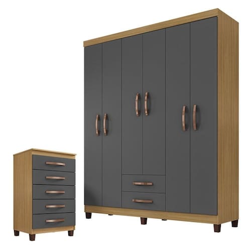 Guarda Roupa Casal Módena com Cômoda Cannes 5 Gavetas Carvalho Americano Grafite – Incorplac