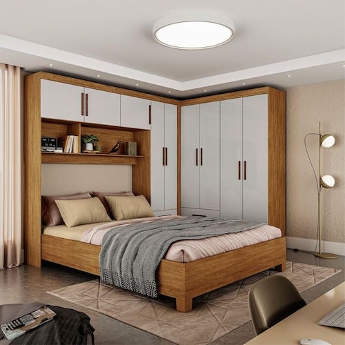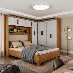 O Guarda Roupa Casal Modulado 5 Portas Hercules 4 Portas e ideal para otimizar o espaco do ambiente e deixar tudo organizado. Possui Maleiros, 2 nichos externos, 3 prateleiras, 9 portas, 4 gavetas com corredicas metalicas. Possui pintura UV, que oferece ao produto resistencia e durabilidade. A Cama Casal com 1,93 de comprimento e 1,44m de largura e a melhor opcao para trazer conforto e elegancia ao seu quarto. Produzida em MDP, com estrado de madeira reflorestada e pes de PVC garante durabilidade e resistencia ao movel. Acabamento resistente com impressao UV e verniz de alta duracao. Ideal para colchoes de 1380mm. Nao acompanha o colchao.