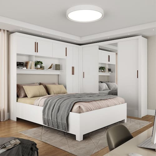 O Guarda Roupa Casal Modulado 8 Portas Santiago Plus com espelho e Cama Casal é ideal para otimizar o espaço do ambiente e deixar tudo organizado. Possui Maleiros, 2 nichos externos, 6 prateleiras, 8 portas, 5 gavetas externas com corrediças metálicas . Possui pintura UV, que oferece ao produto resistência e durabilidade. A Cama Casal com 1,93 de comprimento e 1,44m de largura é a melhor opção para trazer conforto e elegância ao seu quarto. Produzida em MDP, com estrado de madeira reflorestada e pés de PVC garante durabilidade e resistência ao móvel. Acabamento resistente com impressão UV e verniz de alta duração. Ideal para colchões de 138cm. Não acompanha o colchão. Acabamento da Prateleira: Pintura UV Escala de Brilho da Prateleira: Fosco Possui Cabideiros: 01 Acabamento da Gaveta: Pintura UV Possui Organizador de Gaveta: Não Acabamento da Porta: Pintura UV Escala de Brilho da Porta: Semi-Brilho Altura do Espelho: 440 cm Ambiente Principal: Quarto codigo_ean: 7900288069252 Complexidade da Montagem: Média: pode ser montado por mais de uma pessoa e/ou necessite de maior conhecimento para montagem Cor: Branco Cor do Produto: Branco Cor Interna: Branco Escala de Brilho: Semi-Brilho Espessura da Estrutura (mm): 12 mm Espessura das Portas (mm): 15 mm Espessura das Prateleiras (mm): 12 mm Espessura do Espelho: 3 mm Espessura do Fundo (mm): 3 mm Espessura do Fundo das Gavetas (mm): 3 mm Fita Integrada: Sim Formato do Espelho: Retangular Itens Inclusos: 01 Guarda-Roupas e Qr Coode de Montagem Largura do Espelho: 560 cm Linha ou Coleção: Modulado Santiago 7 Pts Manual de Montagem e Instalação: https://product-hub-prd.madeiramadeira.com.br/971551/documents/f6638dc7-ce33-4c07-add1-bac97ba122b0264877840417379791103398.pdf Marca: Carioca Móveis Material da Gaveta: MDP/HDF Material da Porta: MDP Material da Prateleira: MDP Material Principal: MDP Medida de Cada Item: 204x200x35 e 179x200x47 modular: Sim Necessita Montagem: Sim Origem do Produto: Nacional Peso: 190,65 kg Peso Máximo por Gaveta: 5 kg Peso Máximo por Prateleira: 5 kg Possui Calceiros: Não Possui Espelho: Sim Possui Pés: Não Possui Portas: Sim Possui Prateleiras: Sim Produto Montado: Sim Quantidade de Espelho: 04 Espelhos com Tamanhos Iguais Quantidade de Portas com Espelhos: 1 Porta com Espelho Recomendações de Uso, Manutenção e Limpeza: Limpar com flanela ou pano macio seco, não utilizar produtos abrasivos, desengordurantes, álcool ou solvente. Não expor o produto diretamente à luz solar e à umidade. Sistema de Montagem: Prafusos e Cavilhas. Tipo de Corrediça da Gaveta: Metálica Simples Tipo de Dobradiça/Corrediça da Porta: Aço Tipo de Fixação do Espelho: Fita Dupla Face Tipo de Gaveta: Interna e Externa Tipo de Guarda-Roupa: Modulado Casal Tipo de Puxador da Gaveta: Externo Tipo de Puxador da Porta: Externo