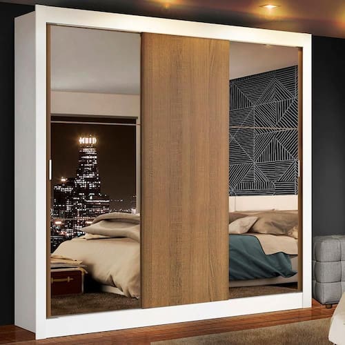 - Itens inclusos: Três (3) prateleiras totalizando seis (6) nichos | Um (1) cabideiro grande | Três (3) portas de correr sendo uma (1) de madeira e duas (2) com espelhos e puxadores em PVC