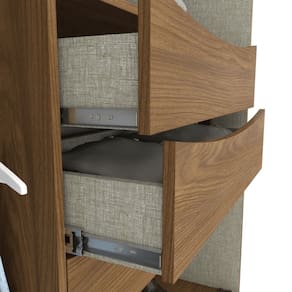Cabideiros e calceiros em alumínio Gavetas com corrediças telescópicas Gavetas com usinagem para pega Prateleiras com divisórias em colmeia Puxadores em alumínio na cor bronze Portas divididas com acabamento soft Porta com espelhos