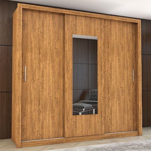 Com 2,08 metros de altura, 1,855 metros de largura e 0,47 metros de profundidade, ele oferece amplo espaco interno dividido de maneira funcional com 3 portas de correr, 4 prateleiras e 3 cabideiros. O design moderno, com espelho integrado, valoriza o ambiente e proporciona praticidade no dia a dia.