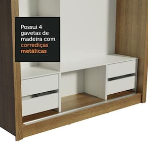Total aproveitamento interno levando em conta o uso de duas pessoas. Nesta versão com quatro gavetas internas com corrediça metálica, diversos nichos que facilitam a organização de roupas, calçados e acessórios. O tubo cabideiro é muito resistente e possui espaço para roupas longas.