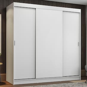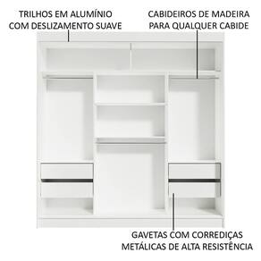 São três portas de correr com trilhos em alumínio e deslizamento suave, que otimizam o espaço do quarto, sem atrapalhar no momento da abertura. Possui também quatro gavetas espaçosas, dois cabideiros com espaço para roupas longas e um cabideiro para roupas mais curtas.