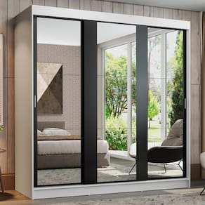 São três portas de correr com trilhos em alumínio e deslizamento suave, que otimizam o espaço do quarto, sem atrapalhar no momento da abertura. Os espelhos dão um grande destaque ao móvel e ampliam o ambiente.